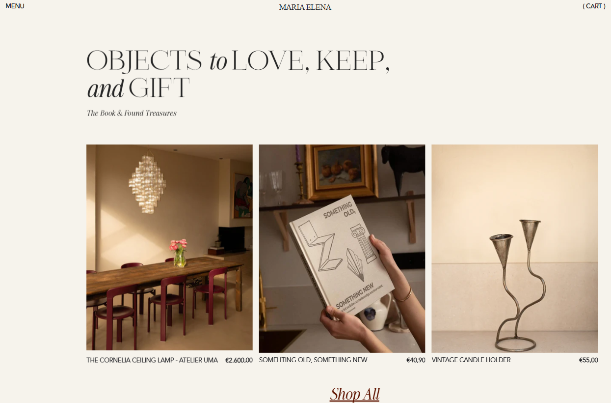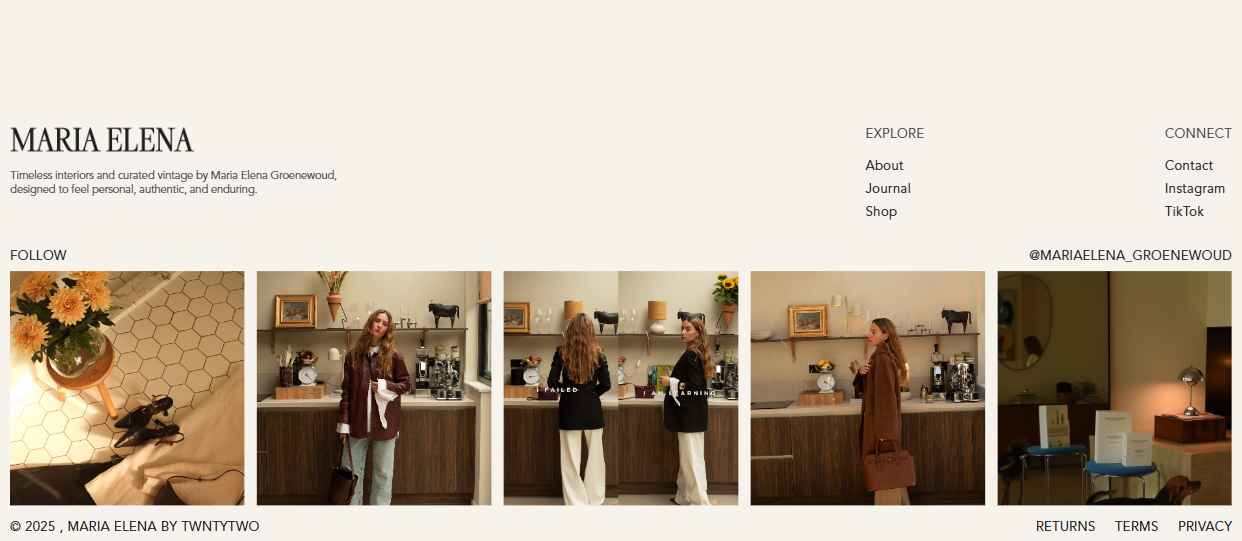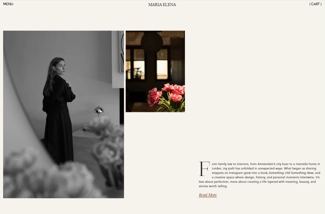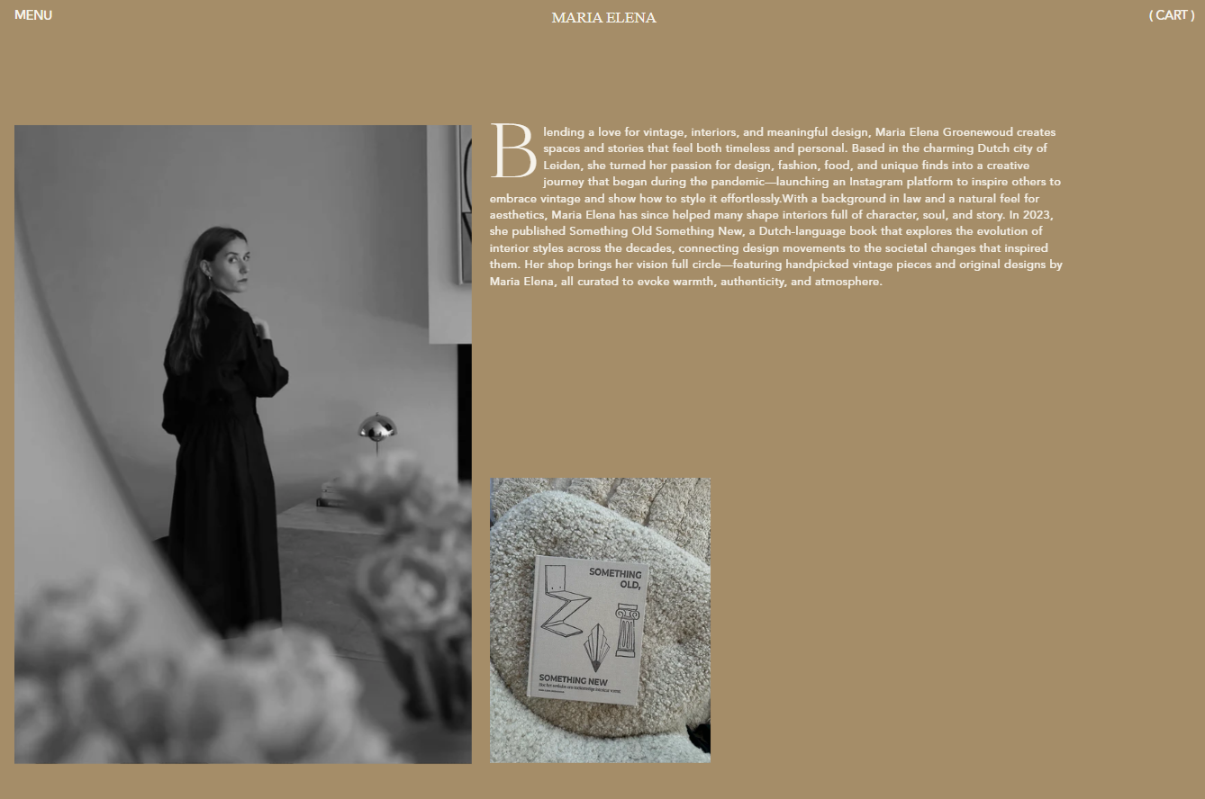 Founded by Maria Elena Groenewoud, Studio Maria Elena blends modern design with carefully selected vintage finds. The brand focuses on interiors and objects that feel personal, meaningful, and enduring.